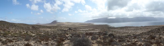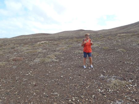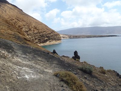 Pas un seul arbre en vue! Quelques touffes de végétation plutôt noirâtres que vertes. Du sable et des cailloux d’origine volcanique à perte de vue. Nous sommes sur la lune! Et le soleil qui monte avec l’intention de nous cuire comme tout ce qui est autour de nous. Mais nous sommes là pour explorer! Juste une petite colline à gravir pour voir l’autre versant (nord ouest), puis une autre, et encore une autre… avant de découvrir la côte bordée de bouillons d’écume. La bonne idée nous prend de revenir en contournant le volcan en face duquel nous avons laissé le bateau – ca devrait être plat en longeant la mer
