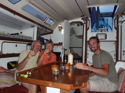 Nous avons mérité de passer l’après midi à nager autour du bateau en attendant l’heure de l’apéritif. Nous dégustons par anticipation le poisson qui se prépare au réfrigérateur accompagné d’un petit rosé.