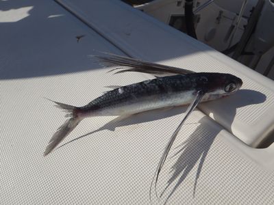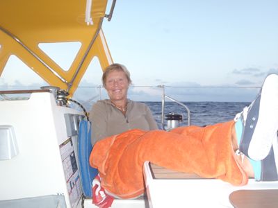 Au milieu de la nuit j’entends un claquement sec. Un hauban a t’il cassé? Je me précipite sur le projecteur pour inspecter le gréement lorsque un vacarme dans le cabinet de toilette attire mon attention. Prudemment j’ouvre la porte pour y découvrir les cloisons couvertes de sang et… un poisson volant gisant sur le caillebotis. Tout compte fait pêcher n’est pas si difficile que ça! Que faut il faire pour que les thons en face autant? Ce n’est pas la ligne que nous trainons qui les attire!