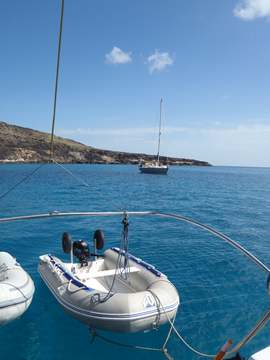 L’Albatros a un petit problème de fuite d’eau douce et prend du retard mais, étant plus grand qu’Hibiscus, nous rattrape avant l’arrivée. Stéphane montre son talent de pêcheur quand il repère une chasse et change brusquement de cap pour traverser le banc de poissons… bilan, un joli thon! Nous nous dirigeons vers une baie que nous avait conseillée Zidane à la Palmeira (voir récit précédent) – cet endroit n’est même pas cartographié sur nos cartes électroniques, donc aucun détails sur les fonds ou la position de la côte rocheuse! C’est une petite baie déserte de sable fin bien protégée, une mer bleue turquoise… tellement transparente que nos amis les requins frétillent autour du bateau… Philippe s’en souvient bien puisque étant le premier à se mettre à l’eau il n’a pas fait long feu pour remonter dans le cockpit. Par la suite nous avons compris que Stéphane avait lancé par dessus bord les restes du thon. Repas de midi à bord de l’Albatros: sashimi de thon et riz accompagné d’une salade dont Nathalie a le secret… quel délice!! Cela vous mettrait’ il” l’eau à la bouche” ???? Philippe se met à la plonge sur la jupe arrière d’Albatros.