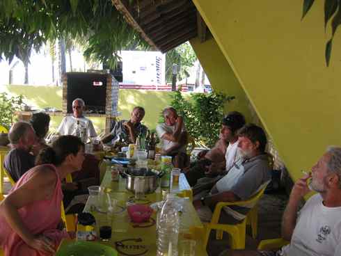 L’ambiance étant sympathique on organise sur Hibiscus un apéritif et nous nous lançons à préparer la boisson traditionnelle nommée “caipirinha”, à base de “cachaça” (liqueur de canne à sucre fermentée)… recette : 1/4 de cachaça + sucre + citron vert coupé en dés + glaçons à volonté…. C’est une boisson qui se boit comme du petit lait, alors pas trop d’abus!!!