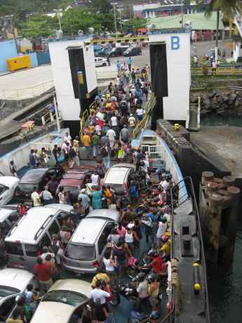 Après 1 heure d’attente dans le hall grillagé ( style “cage à poules “) , nous suivons la foule et montons à bord. Le bateau est imposant et ressemble à un tas de ferraille “flottant” avec des canots de sauvetage “rouillés” et usés par le temps. La traversée dure 1 heure..nous nous laissons bercer , non pas par les flots, mais par une musique bruyante qui semble être naturelle chez les Brésiliens….Le ferry arrive à quai en défonçant bruyamment les pontons qui ont déjà subi des avaries et qui résistent encore au choc!!!! C’est une manœuvre qui n’inquiète personne, ce doit être normal !!!!! Le bateau est plein à craquer et en l’espace de 10 minutes, des grappes humaines se précipitent à terre…