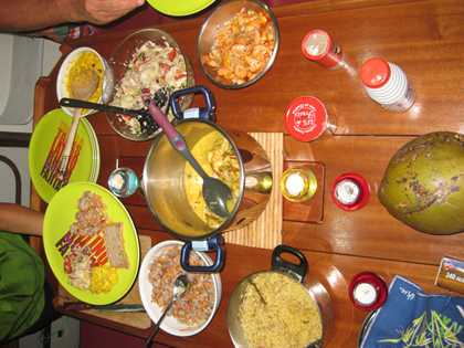 19h30… les premiers convives garent leur véhicule dans le parking. Les autres suivent sans tarder et une grappe d’annexes pend derrière Hibiscus. Les plats et casseroles affluent dans le carré. Après un apéritif rapide nous avons hâte de goûter…