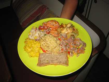Nous: Nos crevettes au gingembre et lait de coco (au fait, dans la recette que j’ai donné il y a quelques semaines, j’ai oublié l’ingrédient principal: une bonne dose de gingembre frais) et gâteau au chocolat