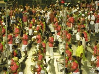 During the two months preceding the carnival the Samba schools repeat their parade on Saturday and Sunday in the “Sambadrome” of Rio. We decide to go there for a taste of the carnival. The “Sambadrome” is like a stadium all in length (an avenue) with bleachers on each side. The neighborhood is crowded!!! Finally we find an entrance, These are the popular bleachers. We take a little height and find a corner of wall on which to put our buttocks among a human tide. What delirium! of the world everywhere undulating to the rhythm of Samba. And among all this street vendors sneak from step to walk with heavy coolers on their backs and offer refreshing drinks..