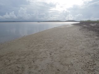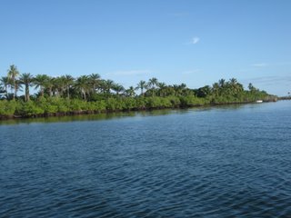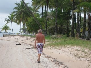 Comme premier mouillage nos choisissons un petit bras de rivière, entre le village de Sapinho et l’ilôt désert de Goio. Nous sommes entourés de mangrove à quelque distance d’un vieux ponton en bois. Vite nous mettons l’annexe à l’eau et débarquons sur une plage de sable blanc de l’ile de Goio… Comme une carte postale avec les palmiers juste comme il faut pour faire de l’ombre. Nous faisons le tour de l’ile à pieds avant que le soleil se couche et de retour sur Hibiscus nous sommes surpris par le silence qui nous entoure. Le moindre petit bruit semble amplifié et prendre tout l’espace… des poissons qui sautent, une voix lointaine, un moteur de barque qui passe au loin…