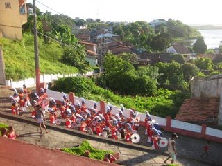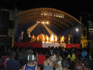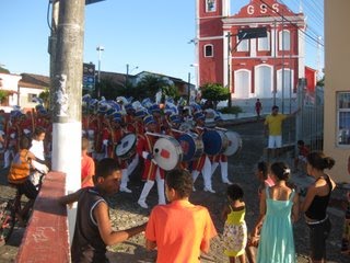 Nous faisons quelques courses et croisons des fanfares et des groupes costumés qui descendent vers le port… De retour sur la place du village alors que le soleil se couche, nous y retrouvons tous les habitants du village… les discours officiels ont commencé… nous en profitons pour retourner sur Hibiscus et prendre une douche. De retour sur la place nous nous mêlons à la population locale agglutinée autour de la scène, des stands de jeux et des vendeurs de boissons… un peu ambiance kermesse. La population est très jeune, ce qui est surprenant pour un village qui est si loin de tout. Bien qu’avec peu de ressources, la vie y est surement plus agréable que dans les banlieues d’une grande ville! Nous sommes les seuls étrangers et comme tout le monde nous applaudissons les groupes d’enfants et d’adolescents qui défilent sur la scène en exécutant des routines de danse bien répétées. Nous osons les hot-dogs à la Brésilienne et les batatas fritas fraiches le tout arrosé de caïpirinha… pas mal!