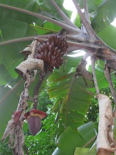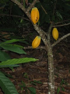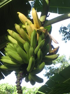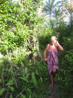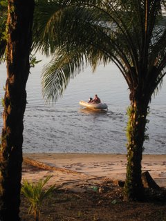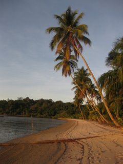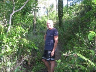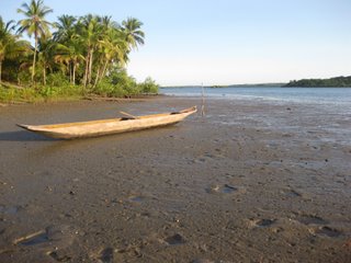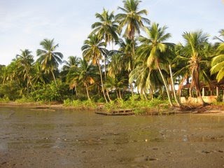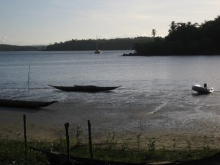 Nous pénétrons dans l’ile en suivant un premier chemin… mais celui-ci se perd dans un marécage. Puis un second chemin qui monte… mais se perds dans des vallées assez pentues et sous une épaisse couverture de bananiers, manguiers, et plantes à cacao. Nous imaginons les moustiques et autres insectes qui commencent à sucer notre sang et sans plus attendre rebroussons chemin…. Ce soir ce sera cuisine à l’huile de dende…