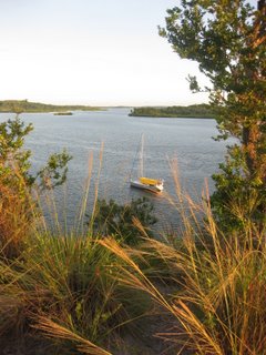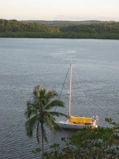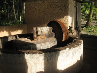 L’Ilha dos Tatus est déserte et nous en faisons rapidement le tour à pieds entre les palmiers et les cocotiers. Une petite grimpette jusqu’au sommet de l’ile pour apercevoir Hibiscus qui semble seul dans toute la baie. Après déjeuner nous débarquons sur Ilha dos Tubaroes qui est beaucoup plus grande. A l’ombre d’un manguier géant une grande table, deux bancs et une femme assise. Les chiens aboient… et nous engageons la conversation… “vive aqui?”… et nous voilà dans une grande conversation avec le peu de vocabulaire portugais que nous avons… cinq enfants… maison à terre de l’autre côté de l’ile… mari parti à cheval dans l’ile planter des pousses de cacao… Elle et son mari exploitent l’ile et produisent de l’huile de “dende” (huile de palme) et elle nous montre le vieux moulin à huile qui est actionné par un cheval. Nous inspectons les palmiers (qui sont bien différents des cocotiers), leurs fruits à différents stages de maturité, le processus pour les faire gonfler, les écraser, décanter….. et récupérer l’huile qui flotte au dessus.