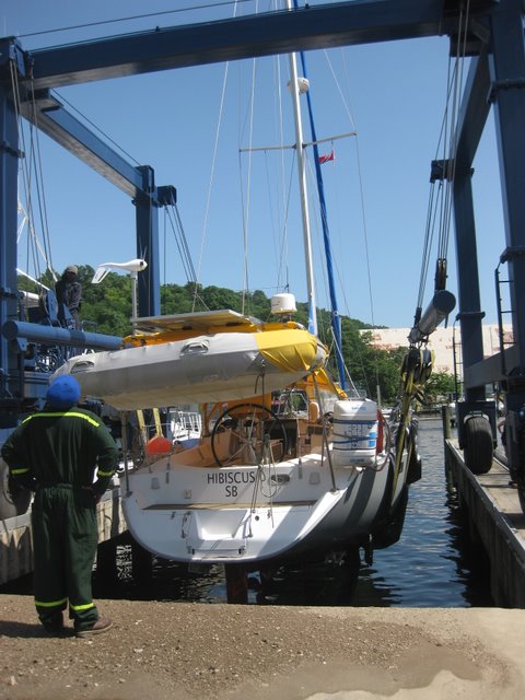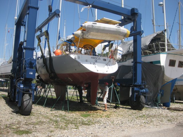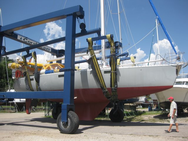 C’est avec une semaine de retard (la grue est tombée en panne le 28 Juin dernier) que nous avons pu remettre le bateau à l’eau et depuis lundi 08 Août nous redécouvrons le clapotis de l’eau sur la coque….. sensation plus agréable que le bruit des perceuses, des ponceuses des bateaux voisins….. fini la vie de “chantier”….!!!