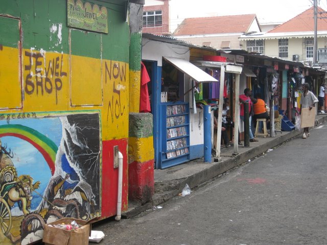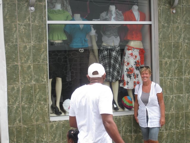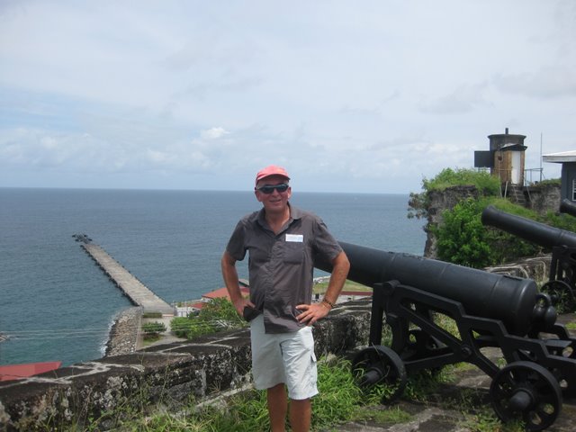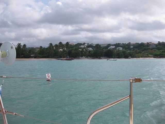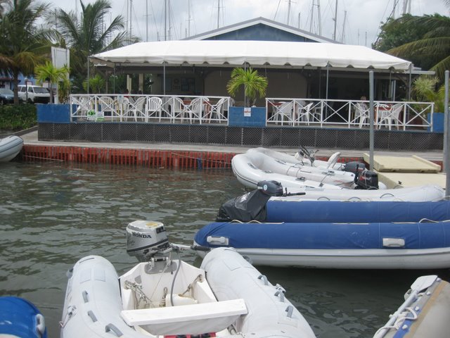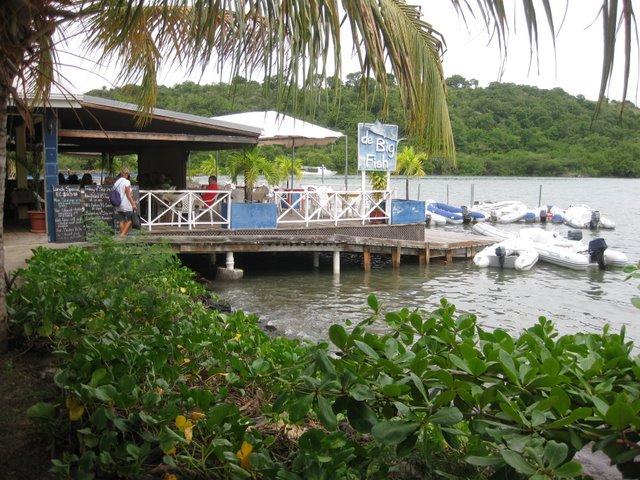 Le rituel commence…. une fois à terre direction immigration et douane…. 3 officiers, chacun à son bureau. Le premier pour nous faire remplir des formulaires et les deux autres, assis côte à côte, qui nous demandent de leur passer ces formulaires… “Ah celui -ci n’est pas pour moi, donnez le à l’autre bureau (distant de 50 centimètres)”… un tampon… “vous pouvez maintenant le rendre au premier bureau (les mêmes 50 centimètres)”… et nous faisons l’intermédiaire d’un bureau à l’autre jusqu’à ce que l’un d’eux nous demande de payer l’équivalent de 25 euros en Dollars East Carrabean ($EC). “Mais nous n’avons pas de ($EC) car comme il se doit notre première démarche à terre est de se mettre en règle avec l’immigration et les douanes!!!!!”…. “pouvez vous nous indiquer le distributeur le plus proche?”…. Grand geste circulaire… “par là…. et je vous rendrai vos papiers à votre retour…. avant 16h00”. Et nous voilà partis à la recherche d’un distributeur de billets… sans argent local et donc sans moyen de prendre le bus! Très vite nous comprenons qu’il n’y en a pas de ce côté de la baie. Nous remontons dans l’annexe et après 15 minutes de moteur arrivons au bar restaurant “de Big Fish” où se retrouvent tous les marins. Le petit ponton à annexes est plein et il faut jouer des coudes, ou plutôt des boudins, pour se faire une place et accrocher notre annexe avec chaine et cadenas. 30 minutes de marche sous le soleil pour trouver le distributeur de billets et retour à la douane. Mais nous avons le temps et tout cela nous fait sourire!
