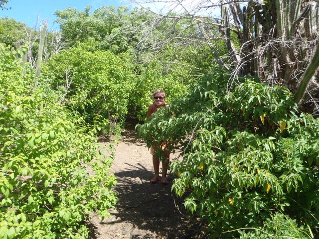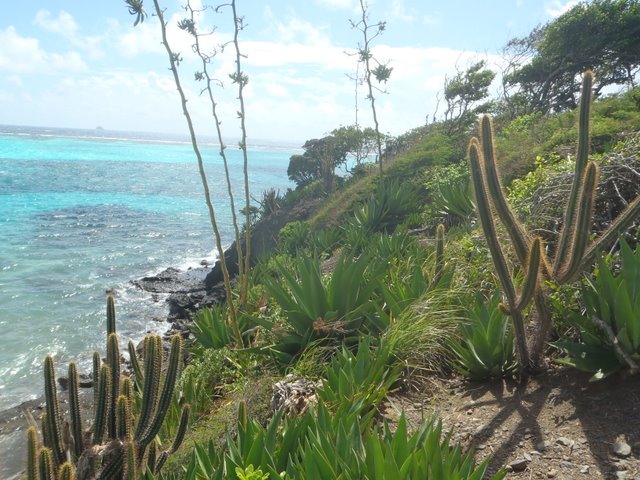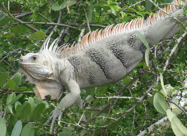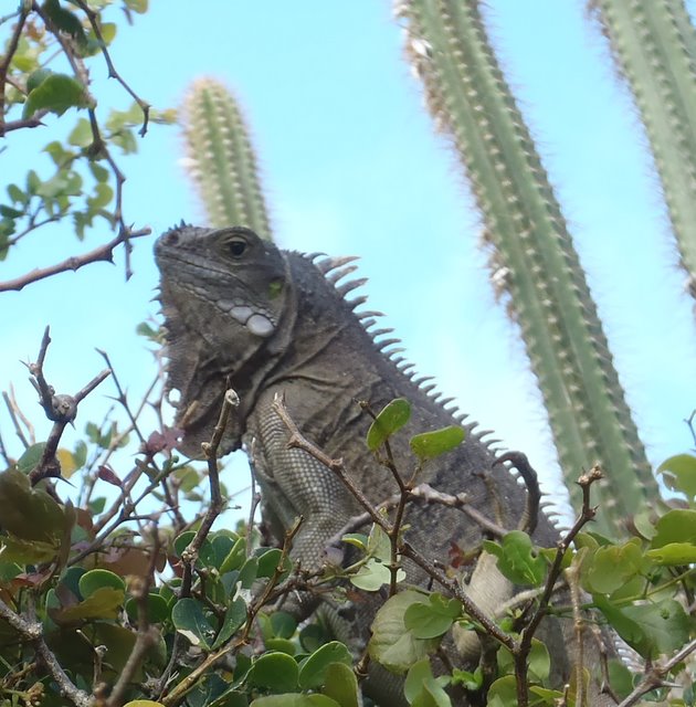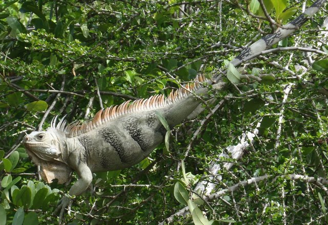 Le matin de bonne heure nous débarquons sur l’ile de Baradal. Un iguane nous attend sur la plage… mais il se sauve sous le couvert des buissons! Nous nous engageons sur le sentier qui mène au sommet de l’ile… les arbustes autour de nous s’agitent… les herbes sèches bruissent… surpris, pour ne pas dire un peu craintifs nous nous arrêtons et rentrons le cou… rien en vue! notre regard s’habitue à l’ombre sous les arbres et là nous commençons à apercevoir des iguanes qui immobiles et camouflés sur les branches, nous épient… près à se sauver de branche en branche si nous approchons trop près. Heureusement certains posent pour la photo avant de disparaitre.