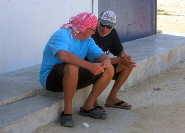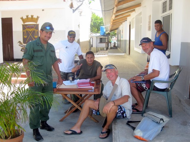 Nous retrouvons Daniel Catherine, Steph et Valérie dans le bureau de la Guarda Costa….Daniel maitrisant mieux l’espagnol, présente nos soi-disant visa/droit de navigation en expliquant que l’ambassade du Venezuela avait bien précisé que seule l’entrée du parc était payante… Junior Durante, le second en charge, nous informe que cela n’est pas légal et qu’il n’existe pas de “droits de navigation” en dehors d’une entrée officielle au Venezuela. Pour cela il faudrait que nous allions à Caracas ou dans l’un des ports d’entrée officiels. Mais on peut s’arranger et il demande 250 dollars US par bateau… Décidés à faire baisser le prix annoncé , Daniel entreprend la négociation… toujours avec le sourire le capitaine des gardes côtes répond qu’il n’y peut rien, il a des supérieurs et doit rendre des comptes… très drôle, cela tourne au dialogue de sourd… Daniel insiste en montrant le visa qui nous a été vendu par l’ambassade du Venezuela comme étant un droit de navigation… demande de contacter la personne qui nous avait reçu à l’ambassade… le capitaine prend bonne note, se lève et nous fait patienter quelques instants… on ne comprend pas bien ce qu’il va faire, mais cela fait partie du jeu… Pendant ce temps, nous décidons ensemble que le prix annoncé doit être réduit de moitié, sinon nous sommes prêts à continuer notre chemin vers des îles moins onéreuses… ou des gardes côtes moins gourmands. Il revient et la discussion reprend… Sa position n’a pas changée. Daniel toujours souriant lui ré explique que s’il pouvait intervenir auprès de ses “supérieurs” pour réduire la facture, nous lui en serions reconnaissants… sinon cela nous obligerait à partir des Roques. Un peu perplexe face à notre ténacité collective, il accepte de “contacter l’ambassade pour vérifier la validité de notre sois-disant “droit de navigation”… c’est un bon signe car nous savons aussi bien que lui que nous sommes Samedi, qu’il n’y a personne à l’ambassade et que de toute façon il n’a aucune intention de contacter qui que ce soi. Il va voir ce qu’il peut faire et propose de nous retrouver en fin d’après midi sur Wakame (le bateau de Daniel).