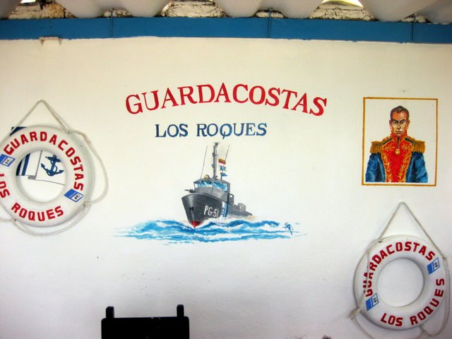 Nous retrouvons Daniel Catherine, Steph et Valérie dans le bureau de la Guarda Costa….Daniel maitrisant mieux l’espagnol, présente nos soi-disant visa/droit de navigation en expliquant que l’ambassade du Venezuela avait bien précisé que seule l’entrée du parc était payante… Junior Durante, le second en charge, nous informe que cela n’est pas légal et qu’il n’existe pas de “droits de navigation” en dehors d’une entrée officielle au Venezuela. Pour cela il faudrait que nous allions à Caracas ou dans l’un des ports d’entrée officiels. Mais on peut s’arranger et il demande 250 dollars US par bateau… Décidés à faire baisser le prix annoncé , Daniel entreprend la négociation… toujours avec le sourire le capitaine des gardes côtes répond qu’il n’y peut rien, il a des supérieurs et doit rendre des comptes… très drôle, cela tourne au dialogue de sourd… Daniel insiste en montrant le visa qui nous a été vendu par l’ambassade du Venezuela comme étant un droit de navigation… demande de contacter la personne qui nous avait reçu à l’ambassade… le capitaine prend bonne note, se lève et nous fait patienter quelques instants… on ne comprend pas bien ce qu’il va faire, mais cela fait partie du jeu… Pendant ce temps, nous décidons ensemble que le prix annoncé doit être réduit de moitié, sinon nous sommes prêts à continuer notre chemin vers des îles moins onéreuses… ou des gardes côtes moins gourmands. Il revient et la discussion reprend… Sa position n’a pas changée. Daniel toujours souriant lui ré explique que s’il pouvait intervenir auprès de ses “supérieurs” pour réduire la facture, nous lui en serions reconnaissants… sinon cela nous obligerait à partir des Roques. Un peu perplexe face à notre ténacité collective, il accepte de “contacter l’ambassade pour vérifier la validité de notre sois-disant “droit de navigation”… c’est un bon signe car nous savons aussi bien que lui que nous sommes Samedi, qu’il n’y a personne à l’ambassade et que de toute façon il n’a aucune intention de contacter qui que ce soi. Il va voir ce qu’il peut faire et propose de nous retrouver en fin d’après midi sur Wakame (le bateau de Daniel).