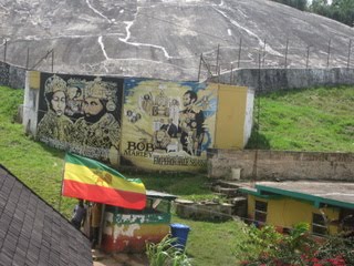 Nous ne pouvions pas passer a coté de “9 Miles”, le village ou est né et a vécu Bob Marley, sans faire la visite du mausolée… avec une centaine d’autres touristes… secoués par des quintes de toux! Oui, c’est légal de fumer de l’herbe a 9 Miles et les vendeurs ne manquent pas a la descente des bus dans chaque recoin. De toutes façons, légal ou pas dans le reste de la Jamaïque, l’odeur suave de la marijuana est partout, dans les bars, le marché, les rues, qui s’échappe des fenêtres ouvertes des voitures…. cela fait partie de leur culture comme le tabac chez nous! Ça donnerait presque envie de s’y mettre, mais avec mon horreur de tout ce qui se fume….