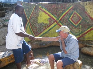 Seymore nous emmène également à “Fire Water” – eau de feu aux propriétés miraculeuses. Une source qui dégage des gaz combustibles, ce qui donne donc l’impression que l’eau brule! Nous nous laissons prendre par le bagout du propriétaire de la source et nous voila plongés dans l’eau en feu à nous faire masser. Très agréable… on verra pour les miracles!