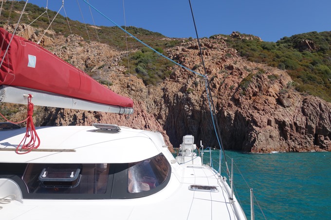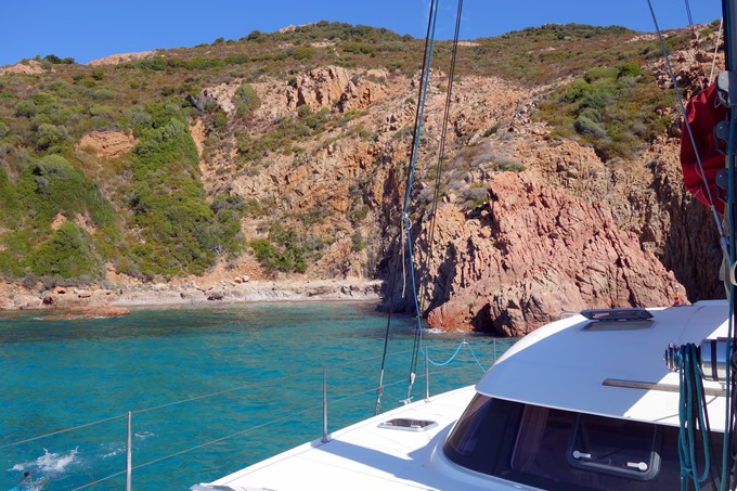 Mouillage à Cala di Palu sous les falaises rouges. Cette baie étroite où il y a peu de place pour éviter est l’occasion de tester la technique de mouillage en portant une amarre à terre. Une première pour nous!