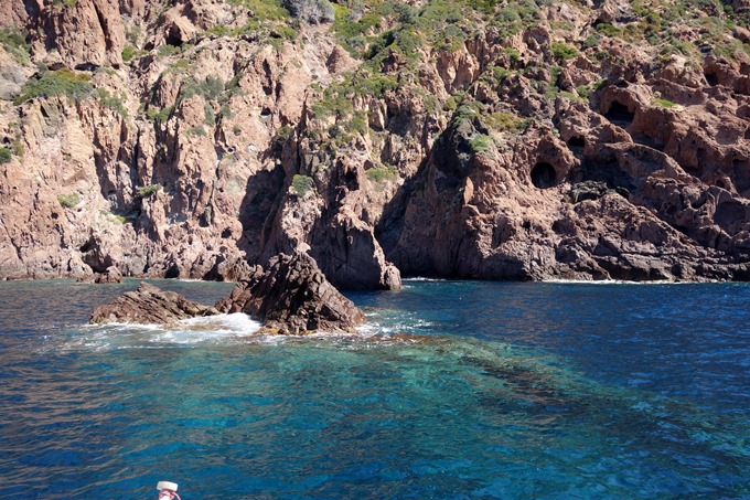 Une dernière étape dans la réserve de la Scandola. Nous sommes seuls dans la zone et longeons la côte de près afin de trouver le mouillage idéal. Enfin une baie protégée de la houle, étroite, avec une dizaine de mètre de fond. Nous posons l’ancre au centre de la baie et Philippe saute à l’eau pour porter un amarre sur un rocher. A peine pose t-il le pied sur le rocher que les gardes du parc apparaissent de nulle part pour nous annoncer gentiment que cela n’est pas autorisé. Nous devons donc déplacer l’ancre de quelques mètres afin de pouvoir éviter sans risque de toucher les roches qui nous entourent. Nous passons la journée au pied de ces falaises avec de temps en temps un bateau de touristes qui fait le tour de Tao pour admirer la beauté de ce site.Mais il est interdit d’y passer la nuit, alors nous continuons vers le nord en passant dans un “trou d’aiguille” entre la Corse et l’ile de Gargalu….