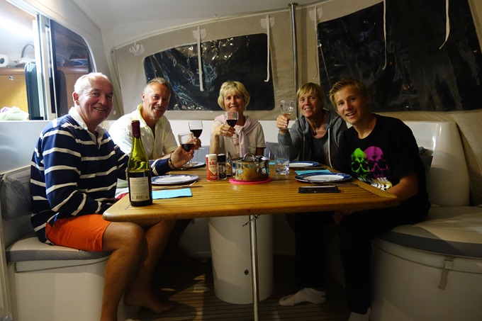 Une rencontre bien sympathique avec l’équipage de “MesAnges”: Hélène, Pascal et Joan qui vivent sur leur voilier depuis un an et sont prêts pour aller voir du côté de l’Atlantique dès 2016. Nous leur souhaitons de belles aventures et autant de bonheur en mer que nous en avons. C’est l’occasion de partager le thon pêché le matin même, arrosé d’un petit vin.