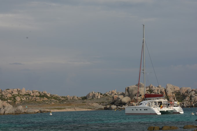 Lundi 26 Octobre: De bonne heure et avant que le temps ne se gâte, nous faisons quelques milles à la voile jusqu’aux iles Lavezzi au milieu des Bouches de Bonifacio. Petit déjeuner au mouillage Cala Lazarina dans quelques mètres d’eau au milieu des cailloux.![]()