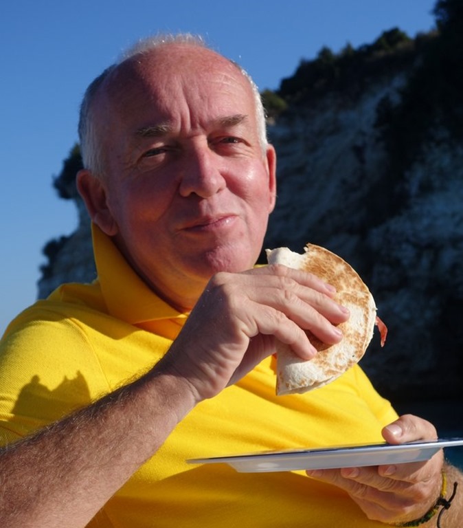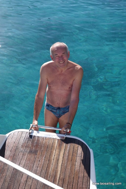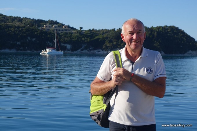 Nous rencontrons Peter , un Anglais qui a son voilier à quai depuis quelques semaines suite à un problème moteur. Nous sympathisons rapidement et il vient boire un verre sur le bateau le soir même. Il est en Grèce depuis quelques années et nous donne beaucoup de renseignements sur les prochains endroits où nous voulons aller. Peut être que nous le recroiserons.