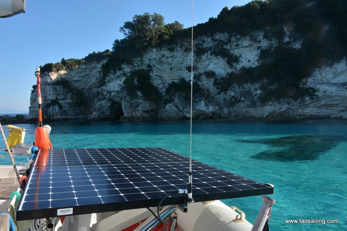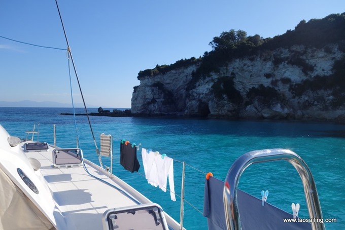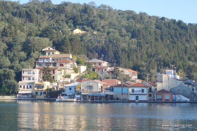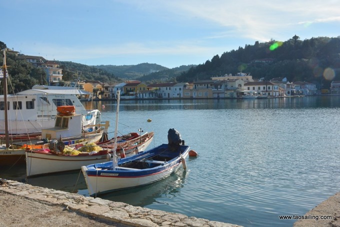 Paxos est au fond d’une baie fermée par un ilot. Le port est un goulet bien protégé de tous les vents. Notre guide nautique indique que “les ferrys et les bateaux d’excursion ne cessent d’entrer et de sortir du port” et “en été, le quai est bondé”… mais Tao est le seul bateau en mouvement.