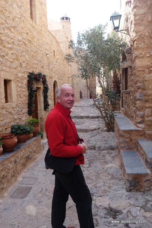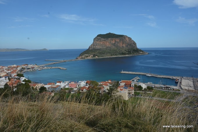 Il est 1 heure du matin le 6 Janvier lorsque nous arrivons devant le village tout illuminé de Monemvasia. Premier mouillage de nuit le long de la plage au nord du village. Au lever du jour nous faisons le tour du “rocher” pour se mettre à l’abri dans le petit port. Enfin… vu le ressac dans le port on se demande si nous n’étions pas mieux au mouillage!