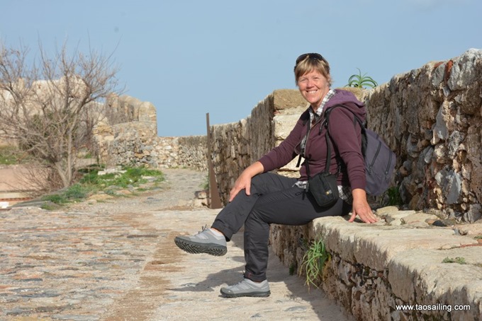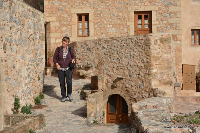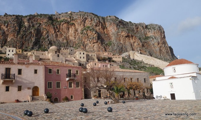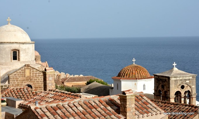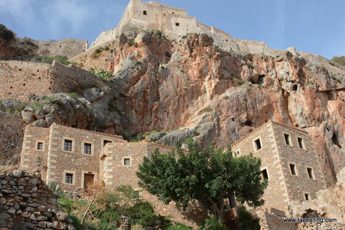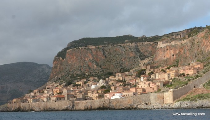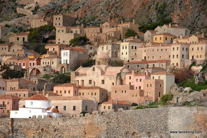 Aussitôt amarrés nous allons découvrir le vieux village au pied du rocher. Monemvasia est une ile de 1,8km de long et 300 mètres de hauteur. Un pont la relie à la terre. Pour se rendre au village il faut emprunter une route étroite qui longe le bord de mer. Monemvasia, d’origine Byzantine est divisé en 2 secteurs : une ancienne ville fortifiée au sommet et un village médiéval en contrebas. Malheureusement l’accès au sommet est fermé.