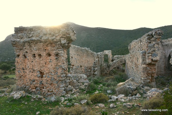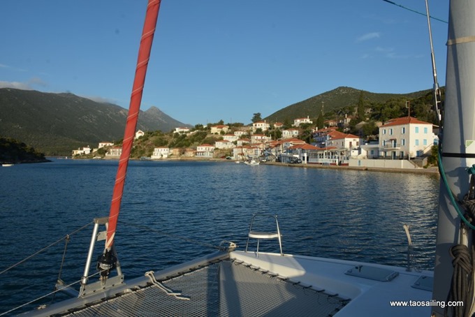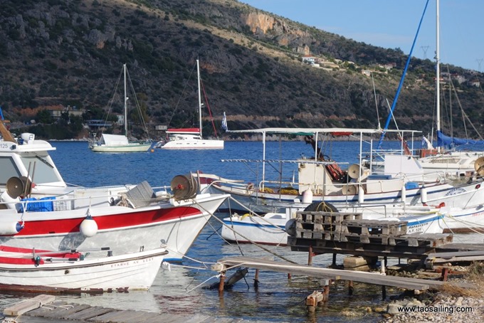Mouillage dans le goulet bien abrité où le se trouve le petit port de Ieraka. Nous sommes face au village qui parait endormi. Trois tavernes éclairées le long du quai semblent ouvertes. Une fois l’ancre bien accrochée, nous sautons dans l’annexe pour aller à terre. Nous déjeunons dans l’une des tavernes à l’ambiance familiale. Le patron nous propose son poisson du jour et nous avons l’impression qu’il veut vraiment s’en débarrasser faute de clients. Nous préférons choisir autre chose.