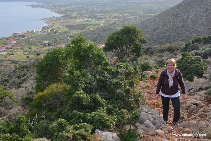 Nous devons trouver un endroit bien protégé car un coup de vent est prévu. La baie de Khaidhari nous semble être un endroit sûr. Beaucoup de bateaux hivernent sur corps mort au fin fond de la baie face aux villages de Dhrepanou / Vivari. Nous jetons l’ancre dans 13m d’eau à l’écart de tous ces voiliers. Le coup de vent annoncé se confirme. Ce jour là nous restons à bord avec l’électronique en marche, le vent atteint 35 Nœuds. De belles journées ensoleillées nous permettent de parcourir des sentiers bordés d’orangers, citronniers, mandariniers et oliviers… sans croiser grand monde!!!