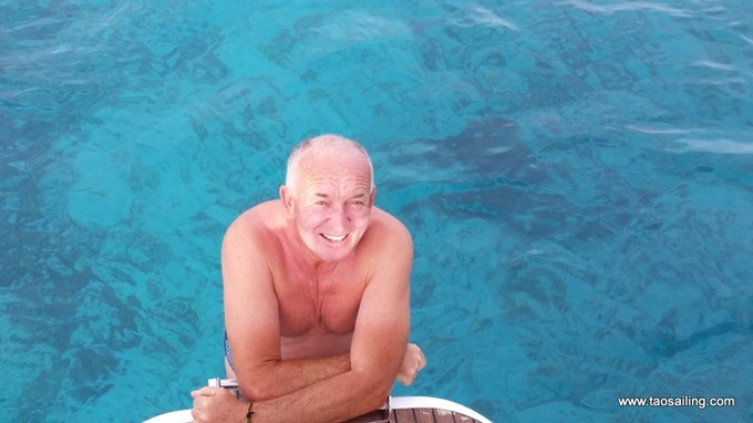 Sophie embarque au port de Mykonos et quittons rapidement le quai en direction de Nisos Rinia (à l’Ouest), dans la baie de Skinou. Premier bain dans une eau turquoise encore un peu fraiche.![]()