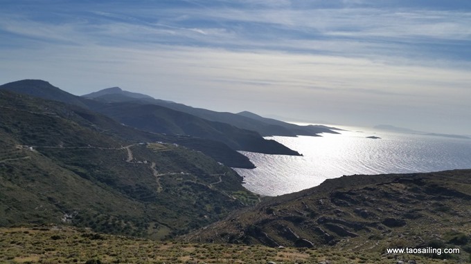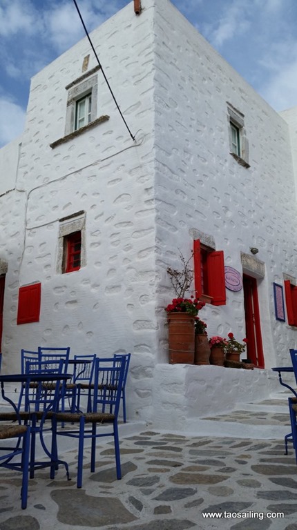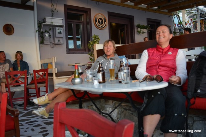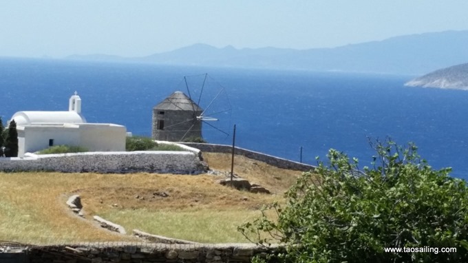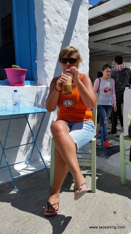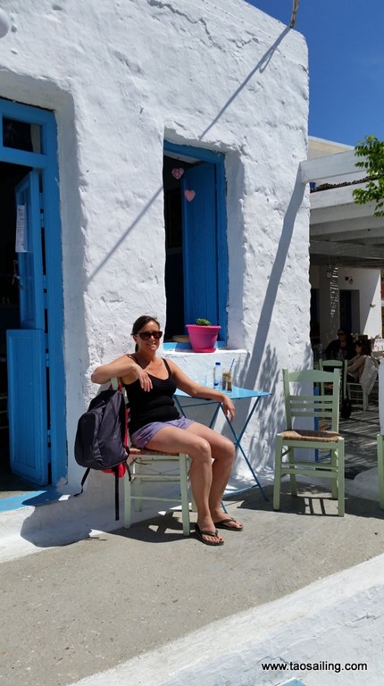 La météo annonce du vent de force 6. Le meilleur abris est la baie de Mirsini au sud est de l’ile. Alors que le vent souffle, Philippe reste à bord et nous dépose à terre histoire de marcher jusqu’au village boire un café frappé et manger une crêpe au chocolat.![]()