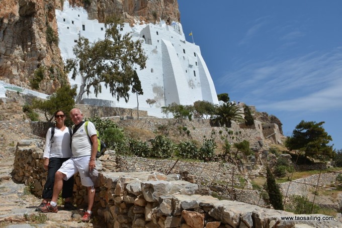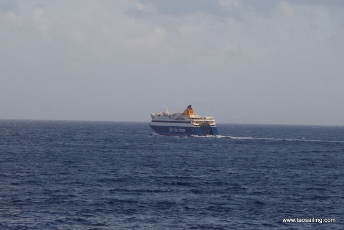 Un vent de 20/25 nœuds au portant nous emmène jusqu’à Katapola à l’ouest de l’ile. Nous n’avons pas d’autre choix que de nous amarrer le long du quai, la baie est occupée par 2 voiliers et nous mouiller à proximité gênerait la manœuvre des ferrys.![]()