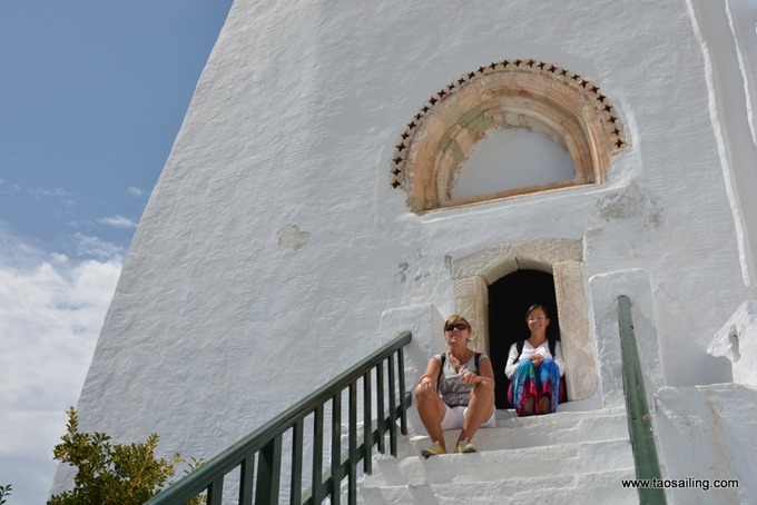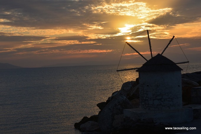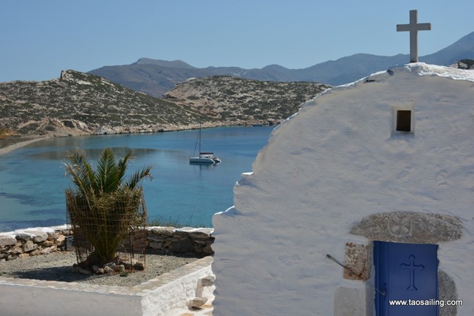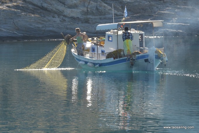 Calme plat dans la baie d’Agiou Ioanniou qui est au nord de Paros. Le matin nous sommes réveillés par le puff-puff d’un bateau de pêche qui remonte ses filets. Nous allons visiter le village de Naousa et en profitons pour faire quelques courses.