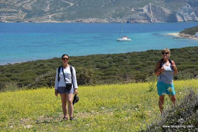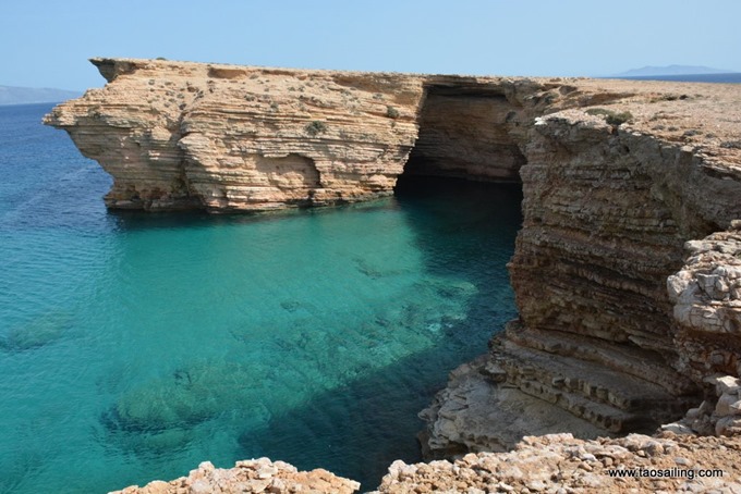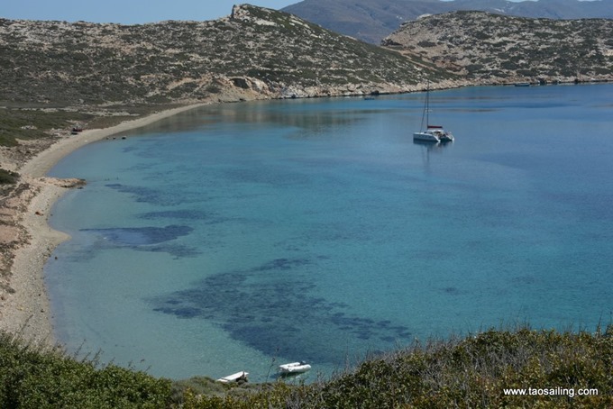 Nous poursuivons notre route vers le sud. Pause baignade et déjeuner au sud de nisos Kavouras, entre Paros et Antiparos. Nous passons la nuit dans la baie bien protégée entre Antiparos et Despotiko. Le passage entre les 2 iles n’est pas très profond, une personne à l’avant du bateau est nécessaire pour guider la traversée.