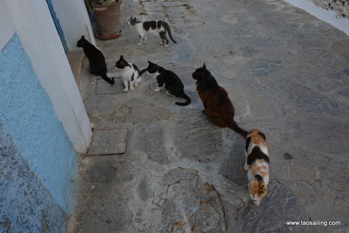 Dans l’une des ruelles de la chroa, une ribambelle de chats attendent patiemment et en ordre devant la porte d’une maison leur gamelle quotidienne ![]()