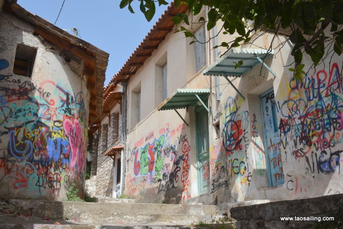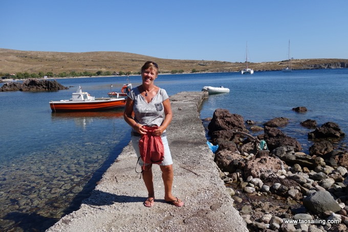 Nous essayons d’accrocher l’ancre dans chacune des petites baies à l’entrée de la baie, mais le fond est de vase molle dans laquelle notre ancre ne tient pas. Dommage! Alors… mouillage en face du village de Skala Loutra mais l’odeur d’égout et l’eau trouble ne nous incitent pas à la baignade.
