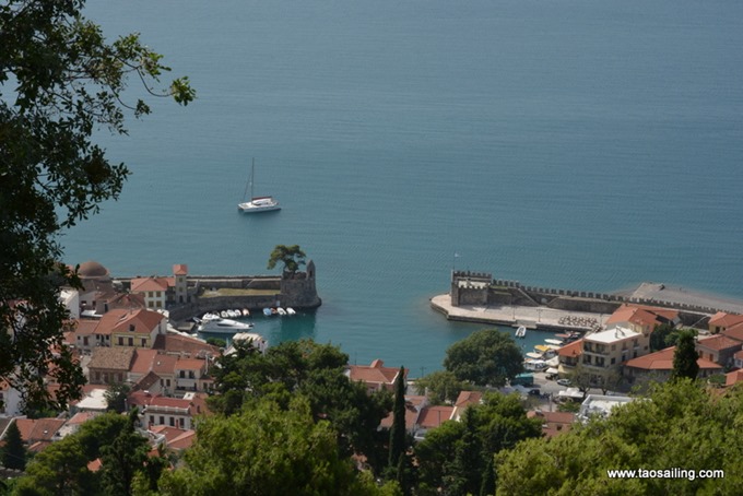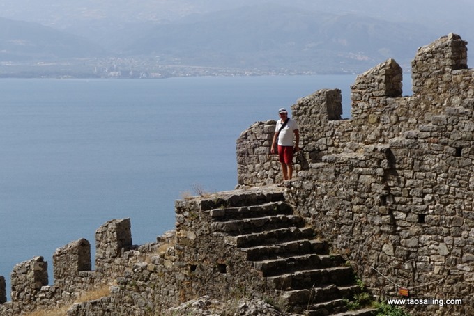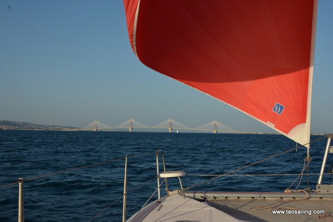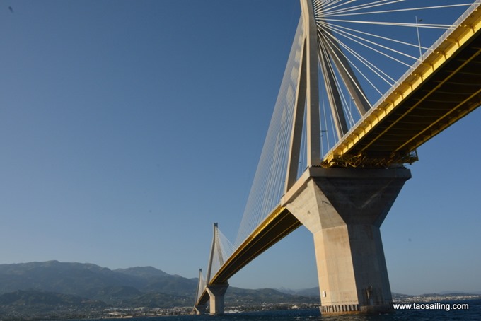 De bonne heure nous quittons Navpaktos pour nous engager dans le golfe de Patras et passer sous un gigantesque Viaduc qui relie le Péloponnèse au continent. De loin on se demande si notre mat va passer dessous!