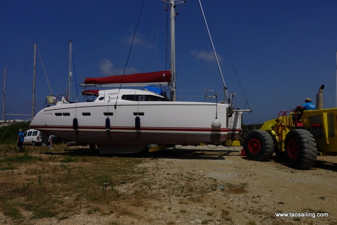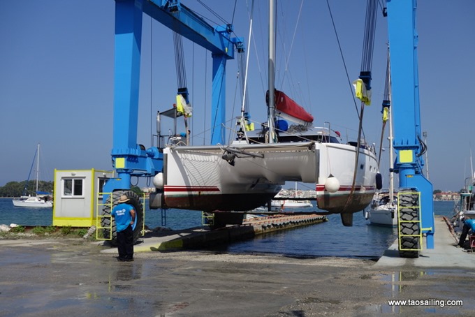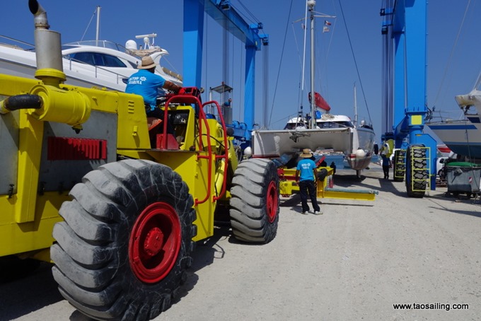 Le chantier a un équipement impressionnant pour manutentionner les bateaux. D’abord sortie de l’eau avec un Travelift suffisamment large pour un catamaran…