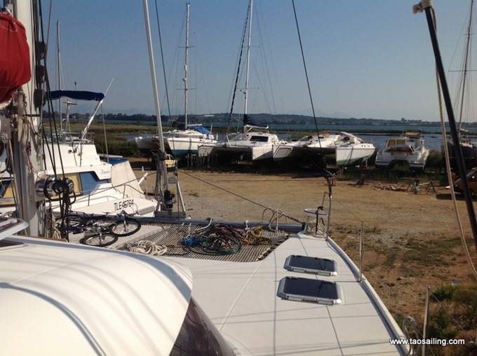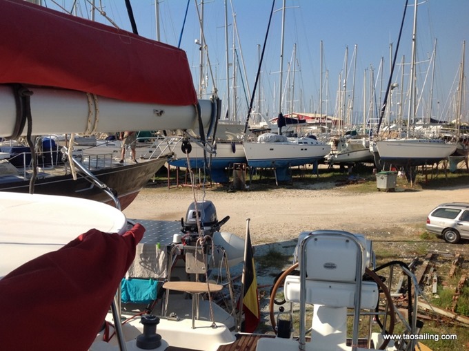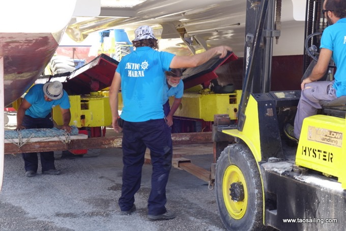 C’est sur le chantier de AKTIO Marina que nous sortons TAO de l’eau pour un mois. C’est un ballet incessant de bateaux qui sortent et retournent à l’eau. Enfin c’est notre tour…