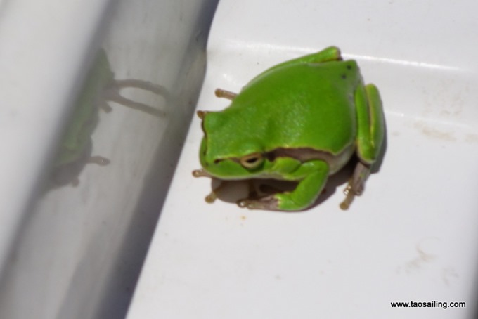 Enfin ca va passer vite et dans un mois TAO sera prêt pour continuer la route vers les océans Atlantique et Pacifique. Dès le premier jour un locataire s’installe dans la baille à mouillage. Il ne faudra pas oublier de la laisser à terre quand nous partirons…