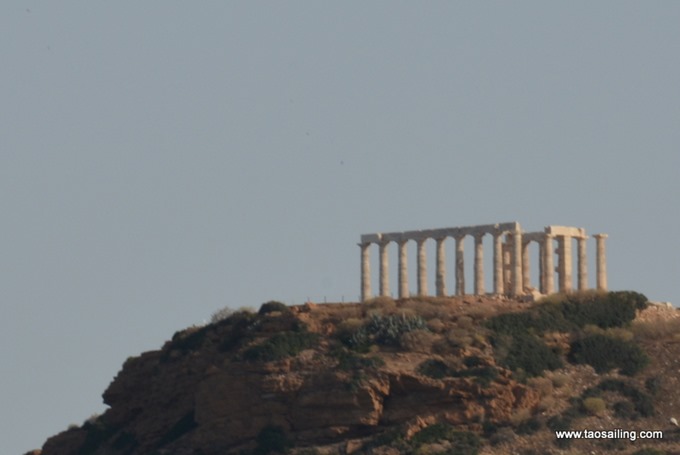 C’est au lever du jour que nous longeons le Cap Sounion et le temple de Poséidon. Une épaisse brume jaunâtre stagne dans la baie d’Athènes.