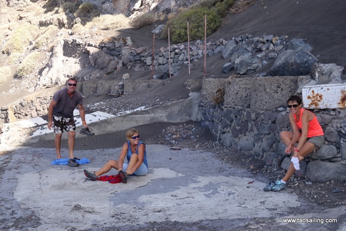 Il y a quand même de forts rouleaux qui déferlent sur la plage, ce qui rend le débarquement impossible en annexe. Nous la laissons donc sur une ancre (petit point blanc sur photo ci-dessus) et terminons à la nage jusqu’à la plage avec deux gros sacs étanches. Session de nettoyage des pieds avant de mettre les chaussures de marche.