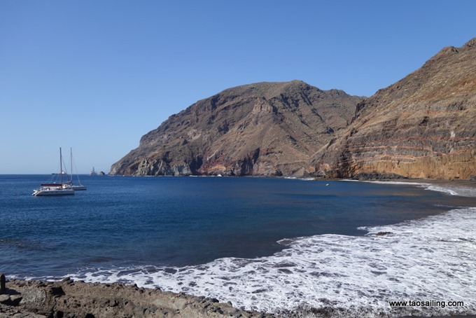 La Baya Antequera sur l’île de Tenerife était l’un de nos mouillages préférés aux Canaries quand nous y sommes passés il y a 6 ans. Rien n’a changé… Les falaises abruptes sont toujours aussi spectaculaires et la plage de sable noir brille sous le soleil.
