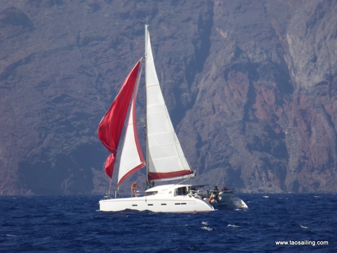 “Mr Happy” ayant terminé ses quelques petites réparations et mises au point, nous décidons de faire route ensemble. Nous quittons le mouillage avant le lever du soleil et Mr Happy nous suit de près. A l’arrivée sur Tenerife, notre gennaker décide de reprendre un peu d’air… en quelques minutes le tout est affalé…