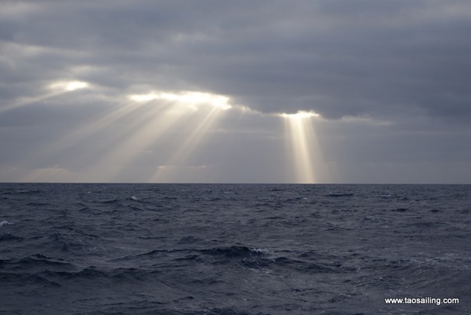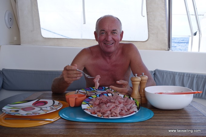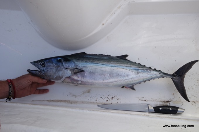 Le cap de Tarifa marque la délimitation entre L’océan Atlantique et la mer Méditerranée. Après plus d’un an à ne pêcher que des sacs plastiques, alors que nous sommes devant le cap Tarifa, l’Océan nous accueille en nous offrant une belle bonite. Pas facile à remonter alors que le vent nous pousse à plus de huit nœuds. Nous devons rentrer le génois et avancer au moteur face au vent pour finalement remonter la bête à bord. Il était temps car les vagues venant de l’arrière se renforcent et quelques minutes plus tard nous faisons une moyenne de 10 nœuds avec des surfs à plus de 14 nœuds! Nous obliquons ver le sud pour traverser les voies de navigation des cargos et rapidement le vent et les vagues s’assagissent.![]()