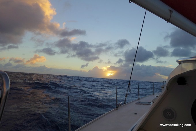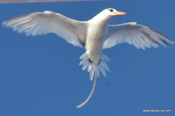 Chaque matin, pendant plusieurs jours, un Paille-en-Queue nous rend visite. Il fait plusieurs tours autour de Tao, puis une fois qu’il semble avoir repéré les mouvements d’air, fait plusieurs tentatives d’atterrissage en haut du mat… sans succès. Est-ce le même oiseau qui nous suit? Nous sommes à 250 milles des côtes quand il nous rend visite une dernière fois. Peut être a t’il senti la terre… ![]()