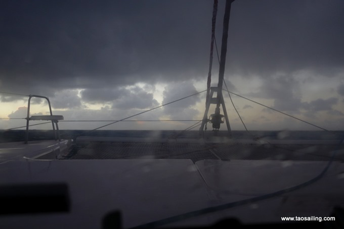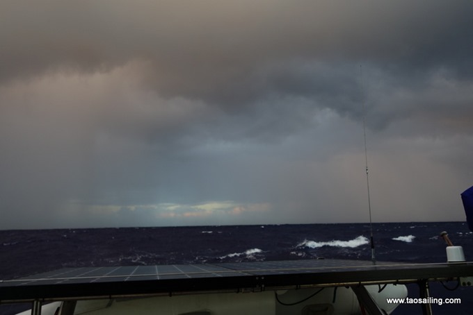 Puis les grains se succèdent avec le vent qui se renforce entre 35 et 40 nœuds! Nous prenons un deuxième ris dans la grand voile pour ne pas être surtoilés pendant les grains. Nous rentrons aussi le génois qui a du mal à rester gonflé avec un vent arrière.