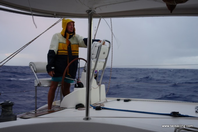 Pendant les grains il faut s’assurer que le pilote garde le cap… et c’est Philippe qui se prend des seaux d’eau sur la tête.