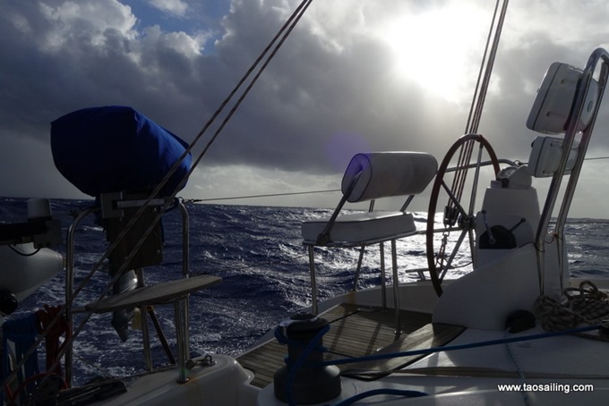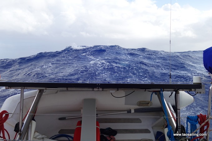 Puis une grosse houle arrière fait son apparition. Malgré les vagues “moyennes” qui sont entre 2,5 et 4 mètres, certaines atteignent les 5 à 6 mètres! Impressionnant quand nous sommes dans un creux et que ces “montagnes” arrivent sur nous. ![]()